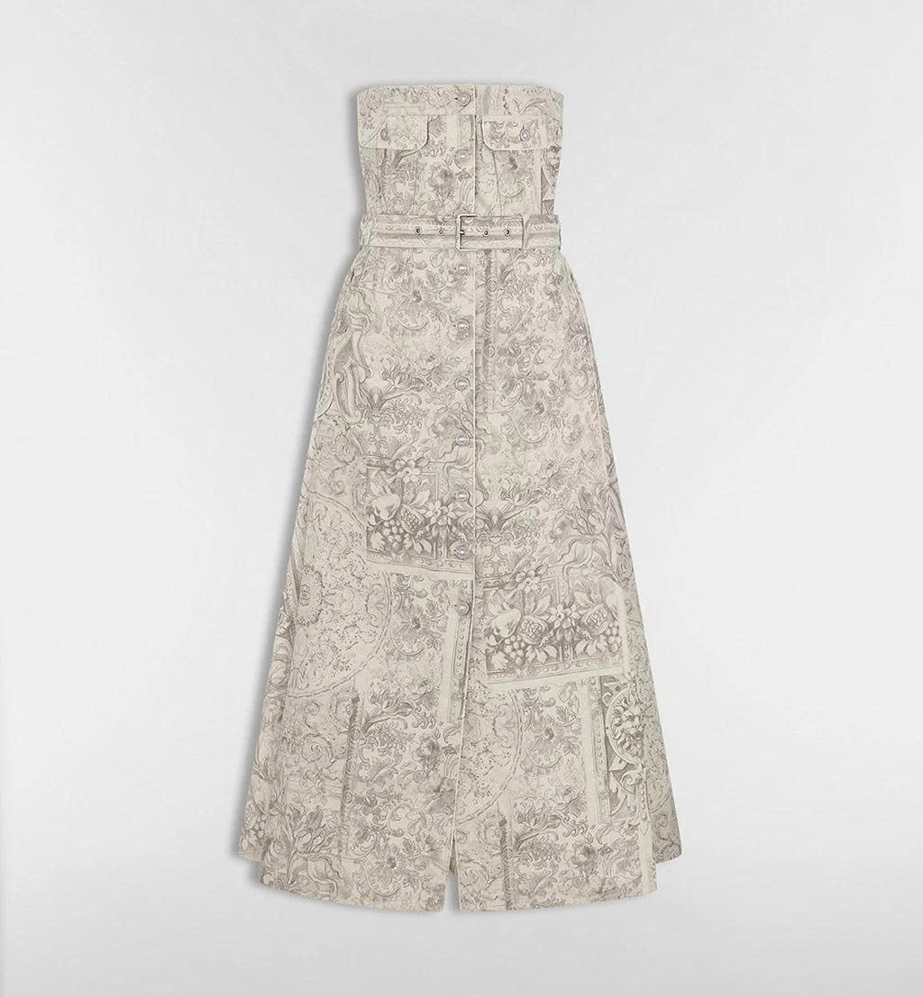 Ra mắt tại Cruise Fashion Show 2026, đầm bustier dáng dài giữa nữ ATRA là sự giao thoa tinh tế giữa tinh thần couture và cảm hứng nghệ thuật Baroque. Họa tiết Dior Barocco lấy cảm hứng từ hoa lá, cánh bướm và những đường arabesque mềm mại, tái hiện vẻ đẹp nữ tính giàu chiều sâu và tính trang trí cao.